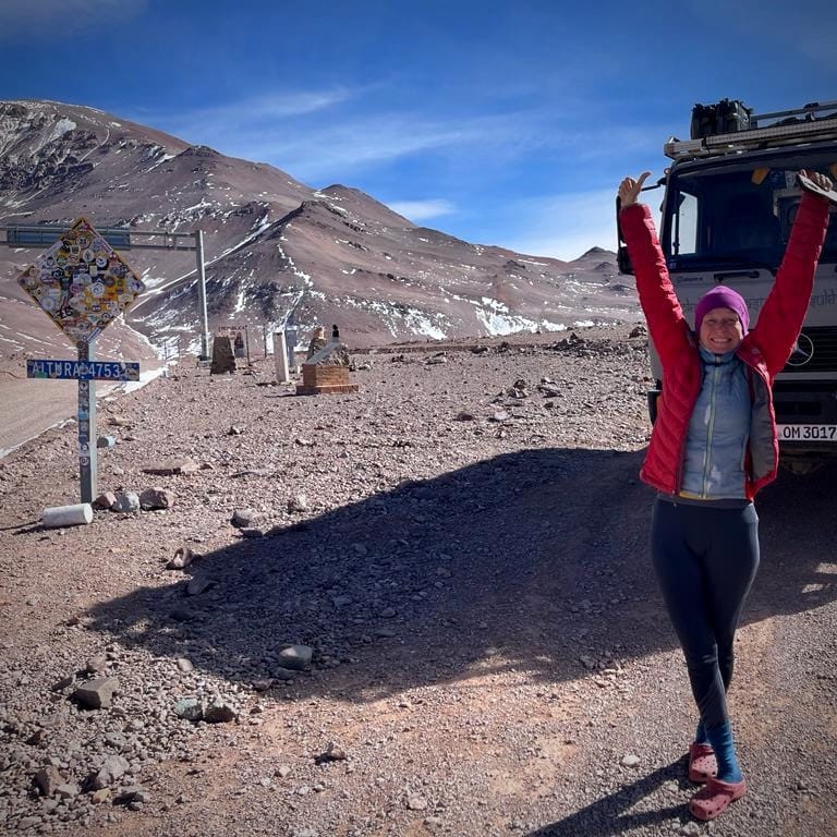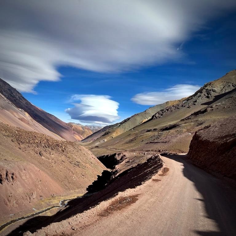 Hoch hinaus wollten wir dann von Argentinien über die Grenze nach Chile. Ein Pass lag dazwischen. Der Paso Agua Negra 4779 m ist einer der höchsten Pässe weltweit und der höchste befahrbare Grenzpass zwischen Argentinien und Chile. Der Mont Blanc ist schlappe 130 m höher – und wir fahren mit dem Lieblingslaster über den Pass, der annähernd so hoch ist, wie der höchste Berg der Alpen, so richtig vorstellen konnten wir uns das nicht. Wir sind einfach Glücksschweine und das mehrfach, denn der Pass wurde am nächsten Tag für die Wintersaison geschlossen, das Wetterfenster passte ideal und wir erlebten eine Landschaft, an der wir uns nicht sattsehen konnten. Eindrucksvoll, vielfältig, ein Farbenspiel ohne Beispiel, einfach einzigartig, ein Geschenk. Hinter jeder Kurve ein neues Motiv, eine neue Perspektive, neue Farbnuancen, mit tief blauem Himmel und UFO Wolken – „iss dat schön hier!!!“ ich weiß nicht wie oft ich das heute gesagt habe.